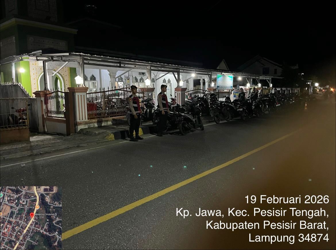 Pengamanan Salat Tarawih, Sat Samapta Polres Pesisir Barat Gelar Siaga di Sejumlah MasjidPesisir Barat – Guna memastikan pelaksanaan ibadah salat tarawih berjalan aman dan khusyuk, Sat Samapta Polres Pesisir Barat menggelar pengamanan dan siaga di sejumlah masjid yang berada di wilayah hukumnya selama bulan suci Ramadan.Kamis malam, 19/2/2026. Personel Sat Samapta ditempatkan di titik-titik strategis, khususnya di masjid-masjid yang memiliki jumlah jemaah cukup banyak. Pengamanan dilakukan mulai sebelum pelaksanaan salat tarawih hingga kegiatan ibadah selesai, guna mengantisipasi potensi gangguan keamanan dan ketertiban masyarakat. Tidak hanya itu, petugas juga melaksanakan patroli di sekitar area masjid serta mengatur arus lalu lintas untuk mencegah kemacetan dan memberikan rasa aman bagi masyarakat yang memarkirkan kendaraannya. Mewakili Kapolres Pesisir Barat AKBP Bestiana, S.I.K.,M.M. Di Wakili Kasat Samapta Polres Pesisir Barat, IPTU Hermanto, S.H. menyampaikan bahwa kegiatan pengamanan ini merupakan bentuk komitmen kepolisian dalam memberikan pelayanan terbaik kepada masyarakat. “Kami ingin memastikan masyarakat dapat menjalankan ibadah dengan tenang dan nyaman tanpa rasa khawatir,” ujarnya.